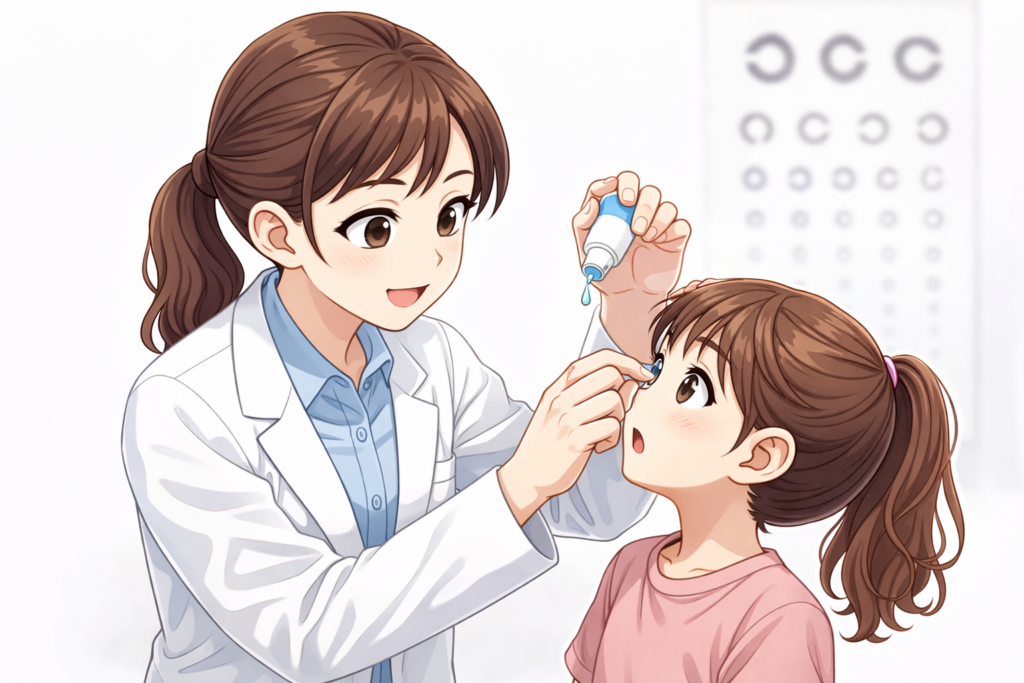 お子さまはピントを合わせる力(調節力)が非常に強いため、目薬でその調節力を一時的に麻痺させ、近視度数を正確に測定する検査です。