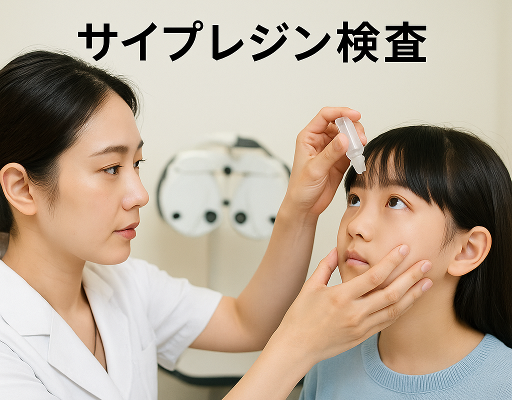 お子さんが持っているピントを合わせる力(調節力)を一時的に麻痺させて、正確な目の度数を測定します。(途中外出はできますが、検査が終わるまでに2時間ほどかかります。)